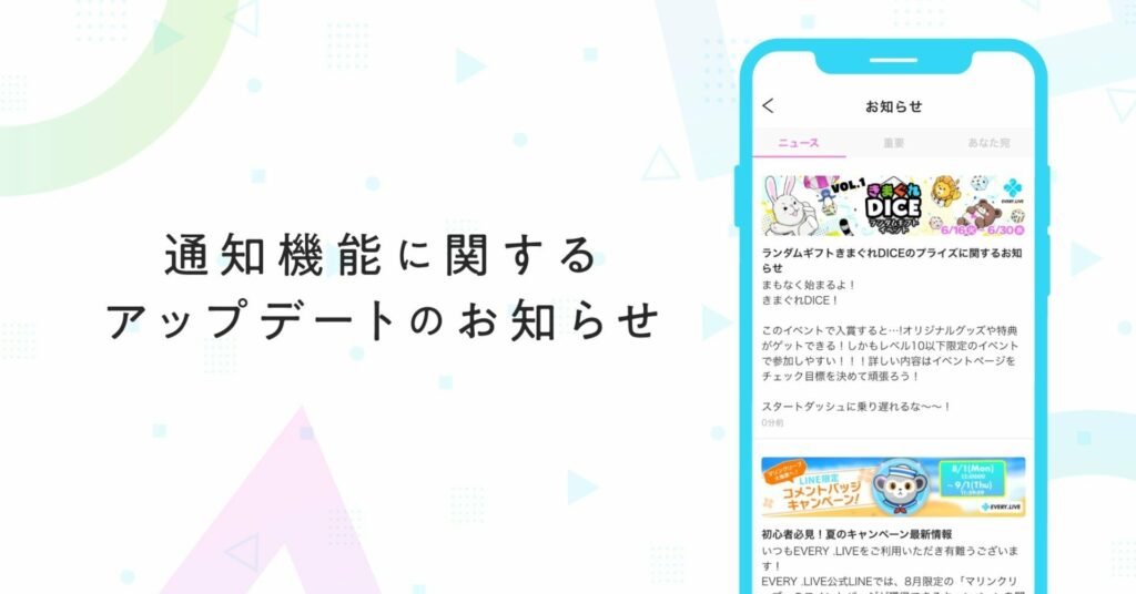 お使いの端末の通知設定でEVERY .LIVEがオフになっているとアプリの通知設定ができませんのでご注意ください。 また端末で細かい通知設定がされているとその設定が優先され、アプリ上でオンにしていても一部の通知が届かなくなります。 予めお使いの端末の通知設定をご確認いただくようお願いします。