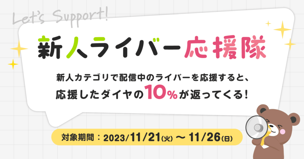 内容:新人カテゴリーで配信しているライバーへ贈ったギフトの10%分のダイヤが還元されます