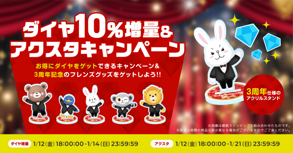今回は、ダイヤ10%増量キャンペーンに加え、オリジナルアクスタキャンペーンも同時開催いたします💎✨