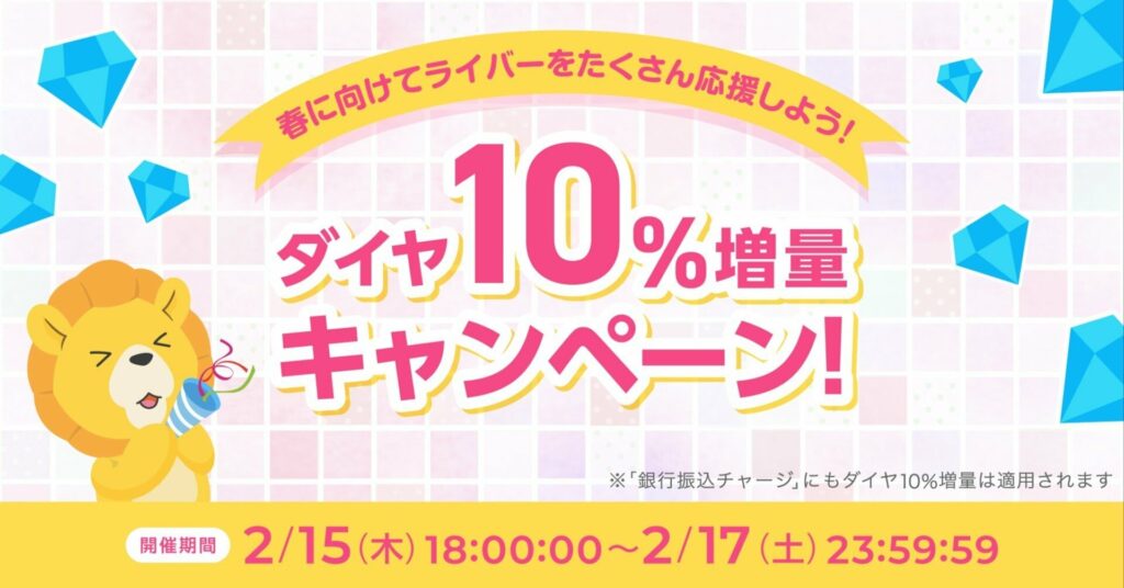 キャンペーン期間の「2024/2/15(木) 18:00:00 〜 2024/2/17(土) 23:59:59」は、everyチャージと銀行振込チャージのメニューが変更され10%分のダイヤが増量されます💎