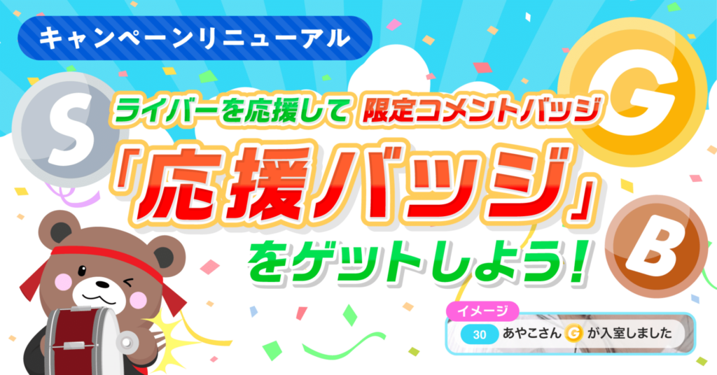 「応援バッジ」は、旧キャンペーン同様にユーザーの皆さまの応援(ライバーさんへのギフト)に応じてプレゼントされる【コメントバッジ】となります📛