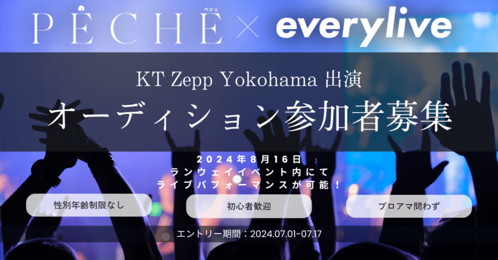 2024年8月16日に開催される「presented by everylive PECHE_party あなたと過ごす白昼夢 2024 SUMMER」の「everyliveステージ」にて、音楽パフォーマンスステージの出演をかけたオーディションを開催します。