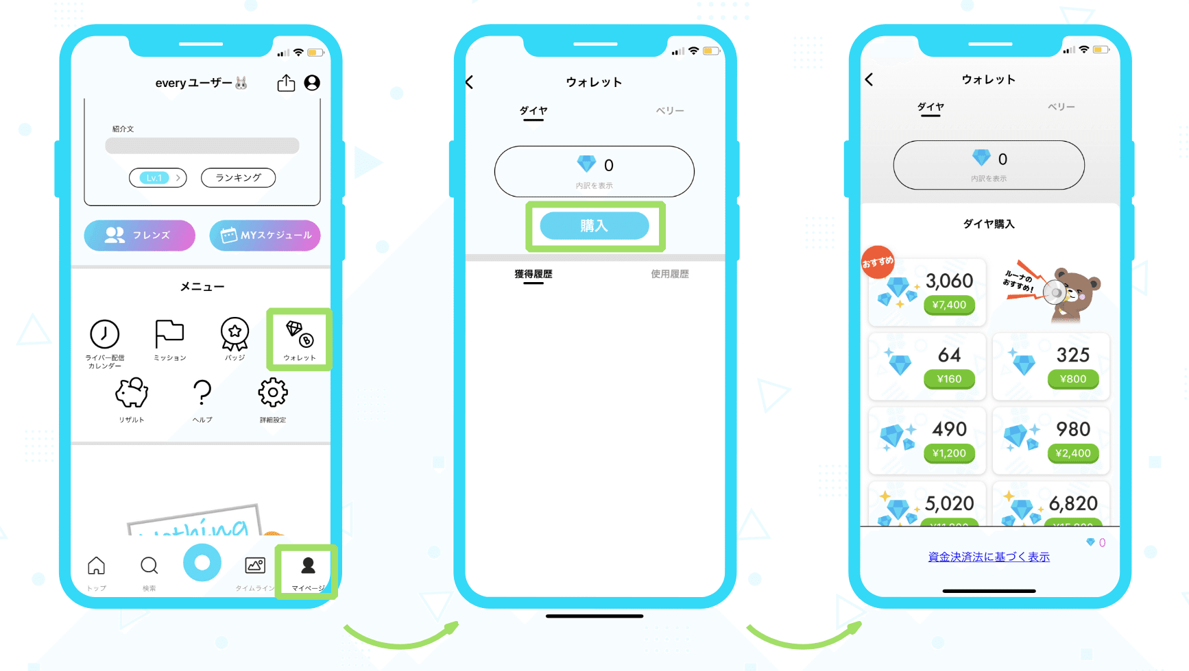 アプリ内チャージはeveryliveアプリの右下のアイコン『マイページ』から『ウォレット』>『購入』と進むとチャージできます
