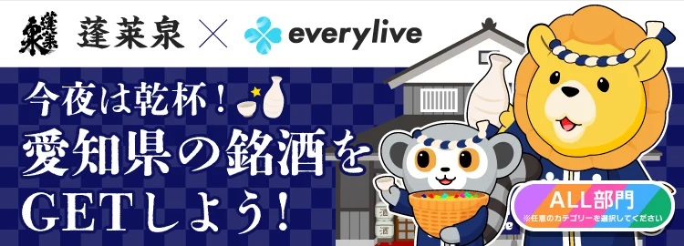 | イベント名称 | 蓬莱泉 × everylive 今夜は乾杯!愛知県の銘酒をGETしよう! |
